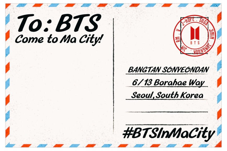 Here is your chance to invite BTS to come check out your city or a city you’d like to have them visit on tour!Take one of the invitations below and personalize it or make your own post or video on why they should come to your city with the hashtag #BTSInMaCity.