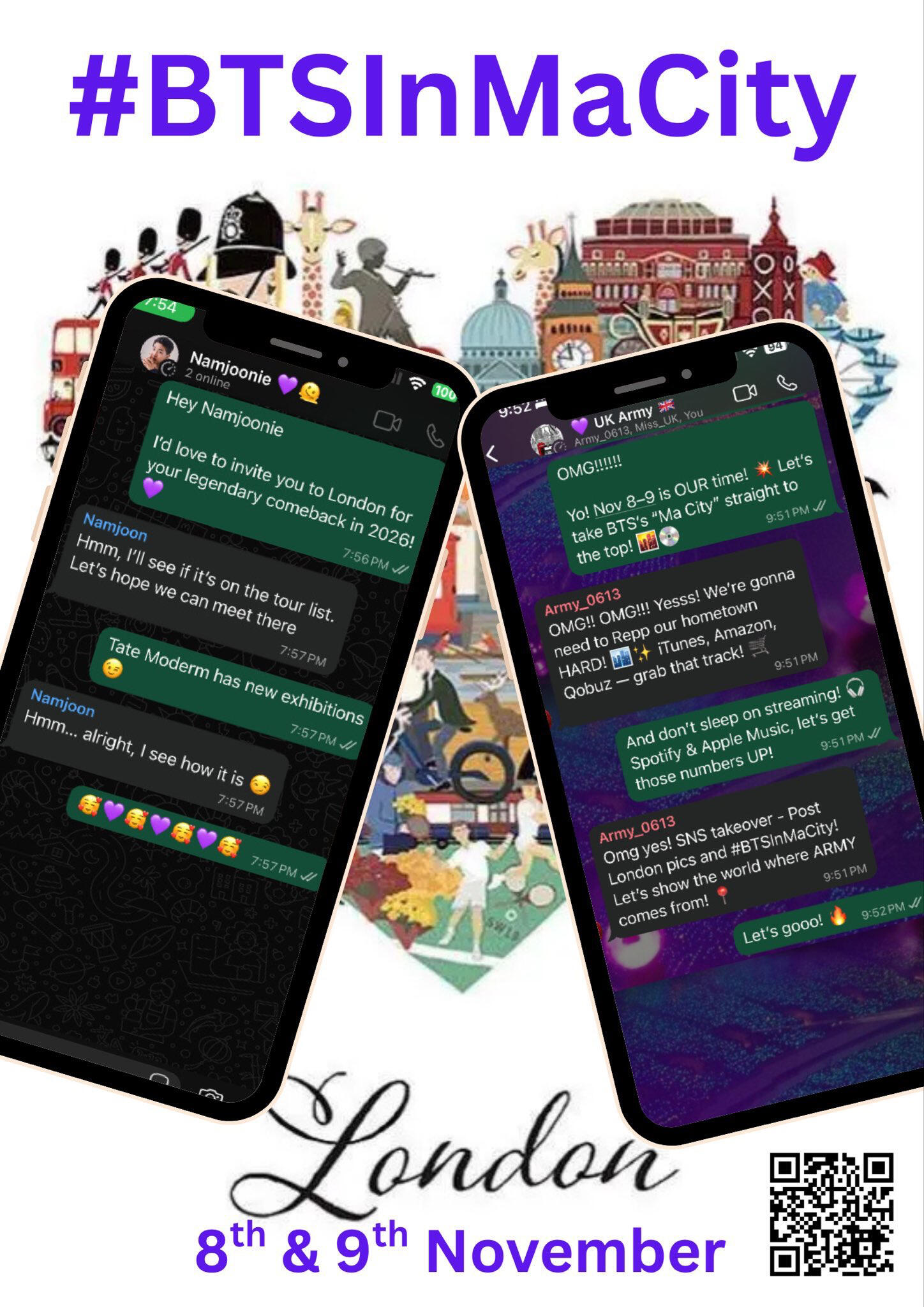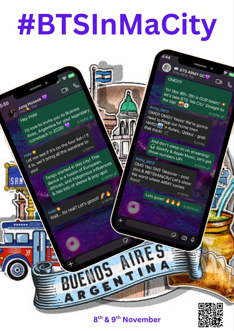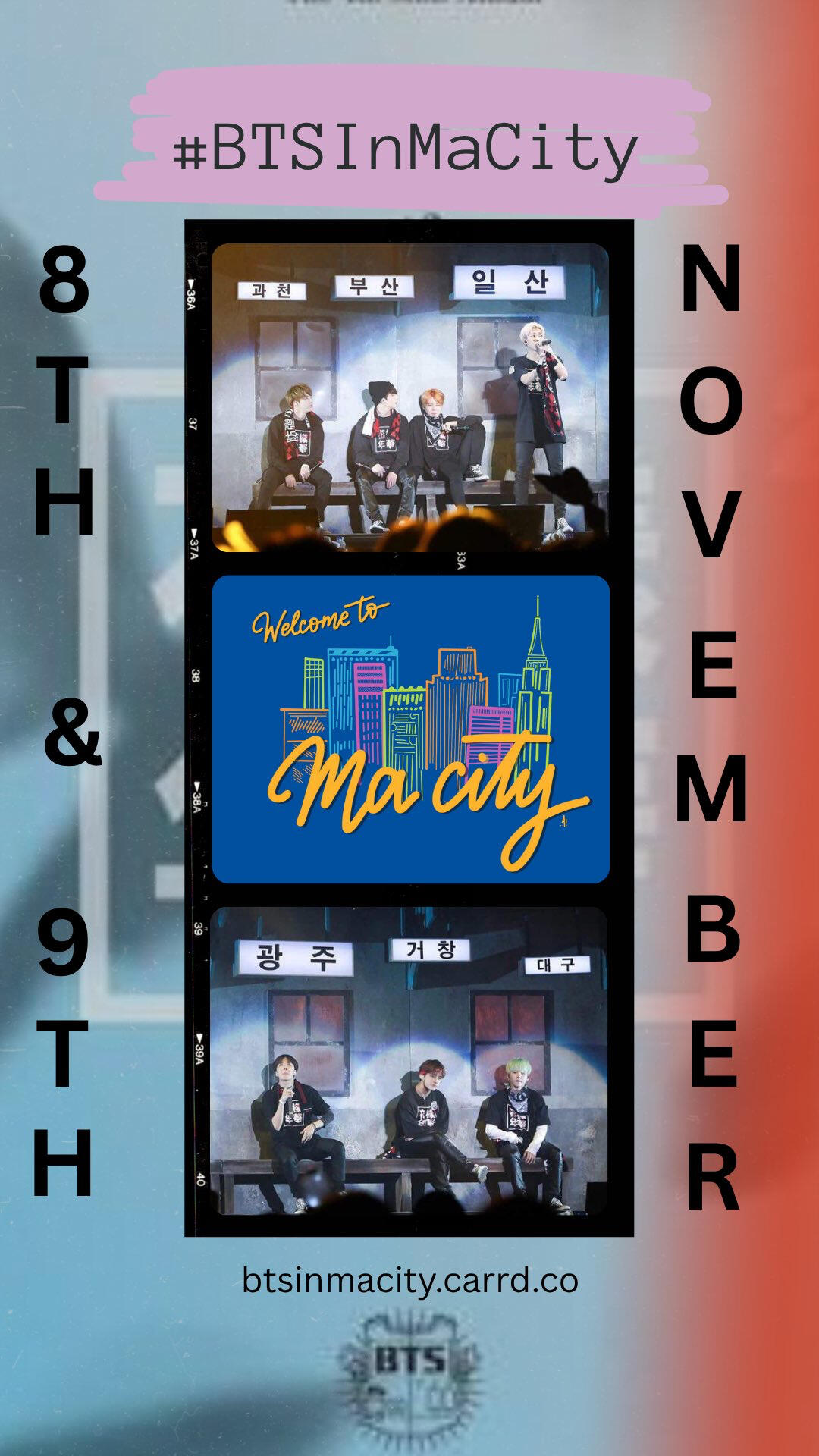 On November 8th & 9th beginning at 2P KST invite BTS to your city for the 2026 Comeback by buying & streaming “Ma City” while spreading the hashtag #BTSInMaCity.Post pictures or videos of your city with why they should come or use some of our special invitations!