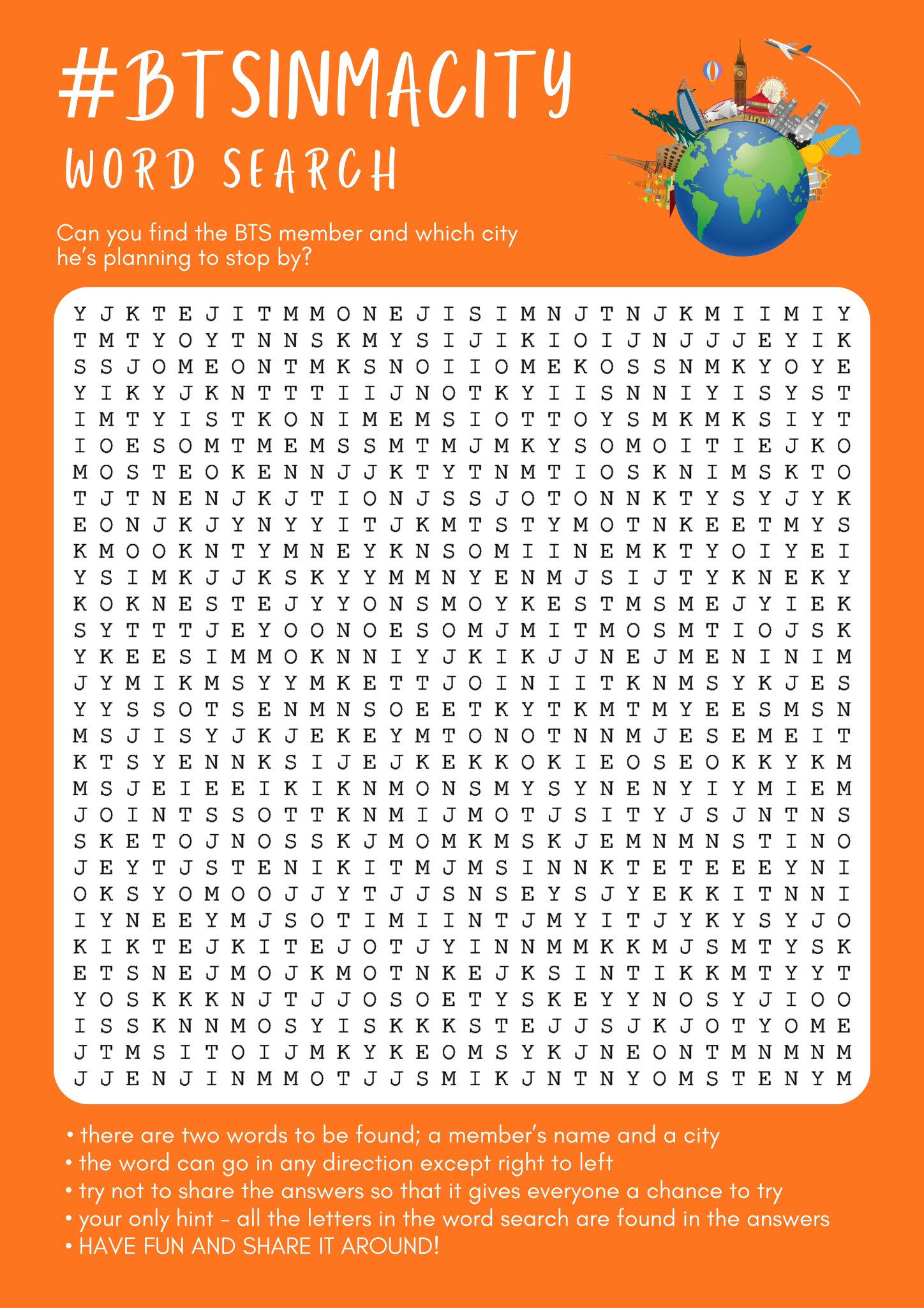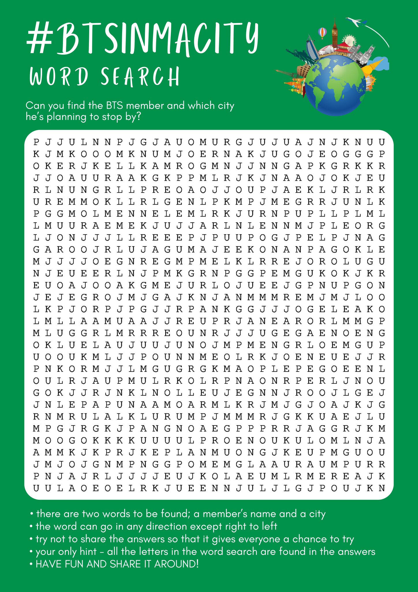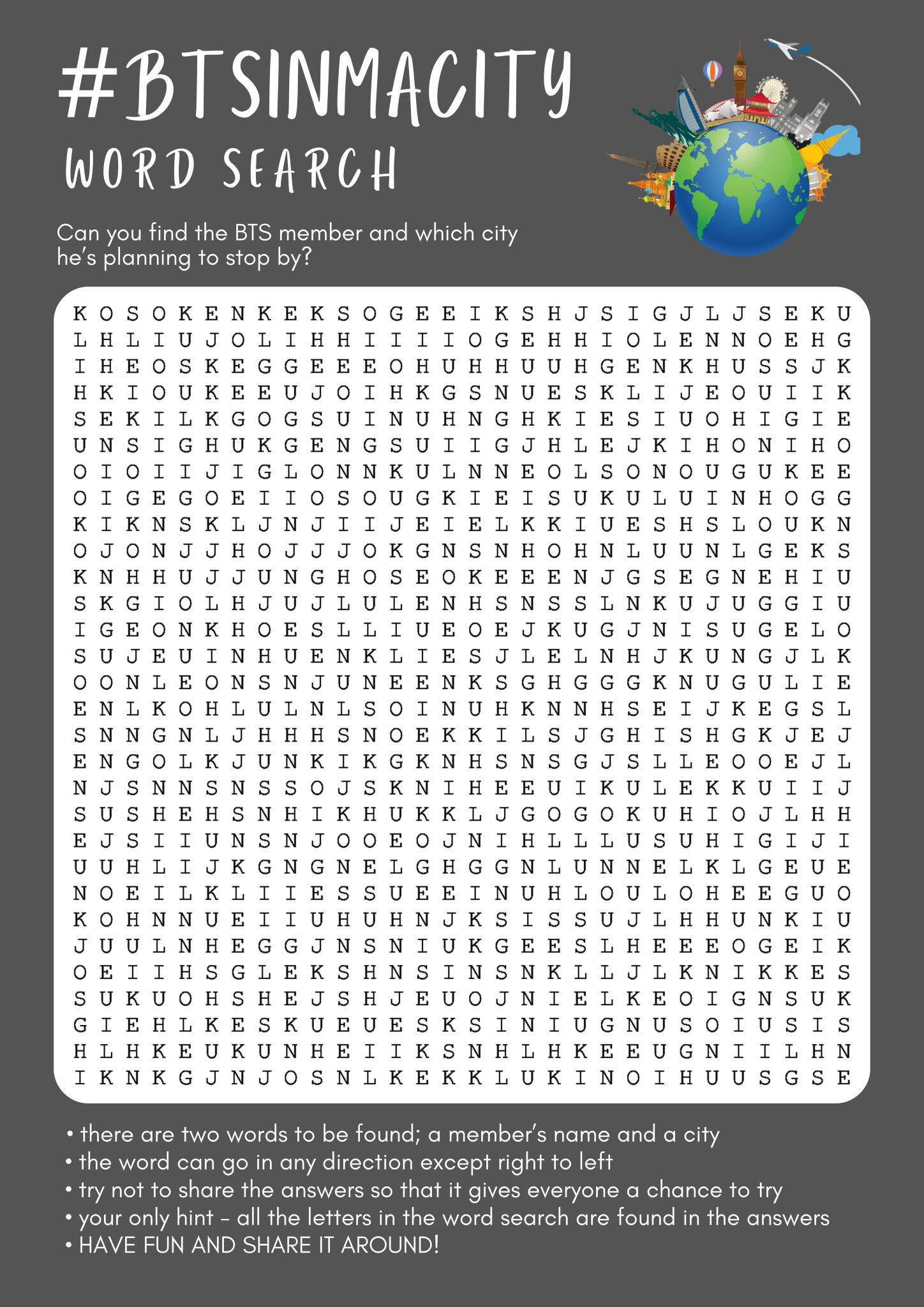 Can you find the missing BTS member and which city he’s planning to stop by?Rules: