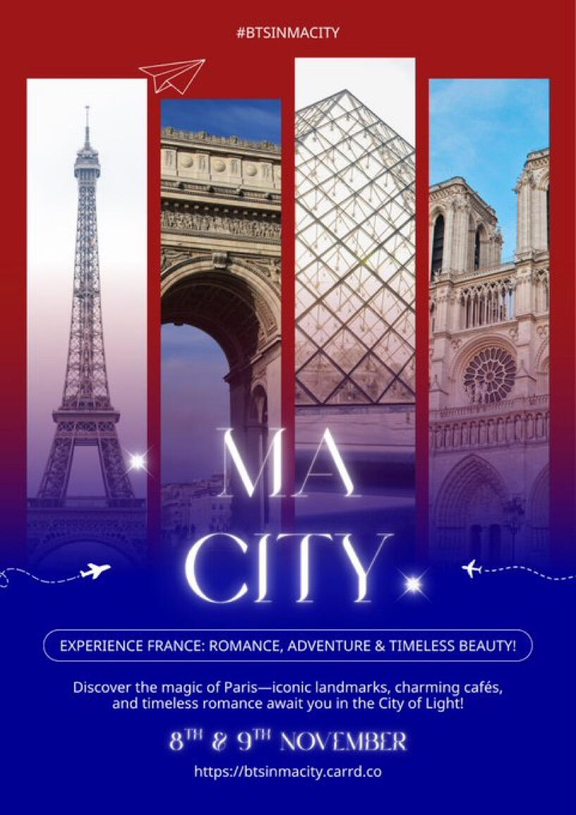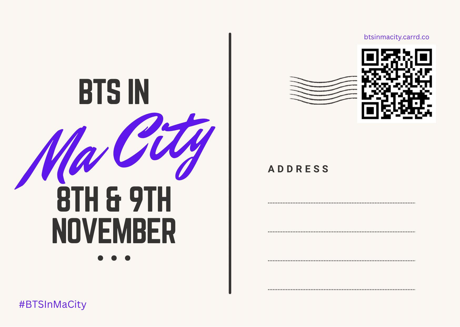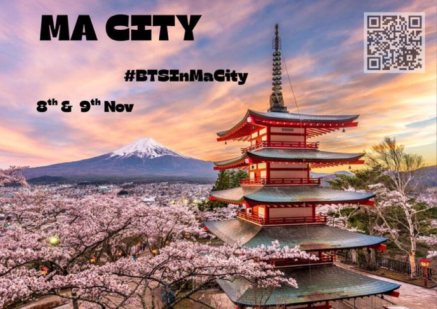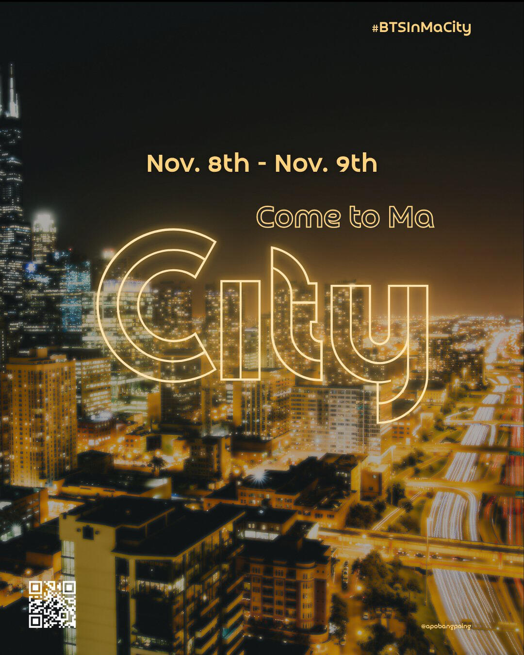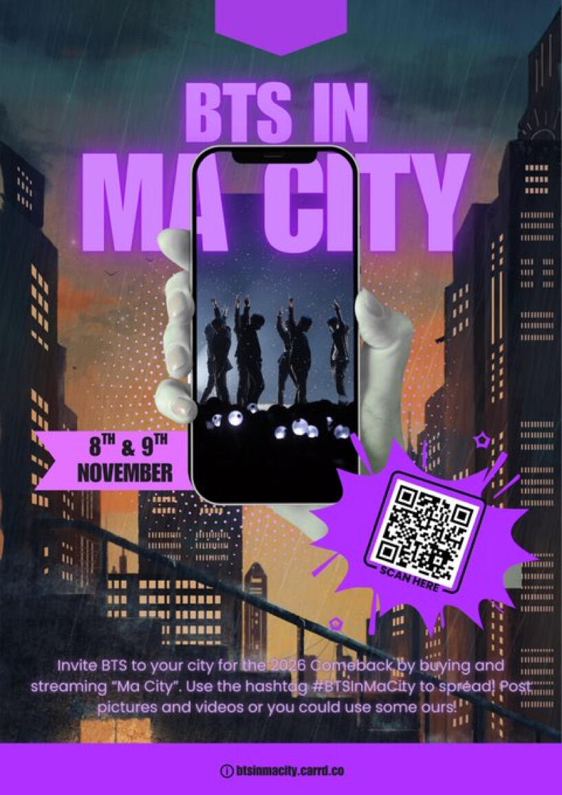 On November 8th & 9th beginning at 2P KST invite BTS to your city for the 2026 Comeback by buying & streaming “Ma City” while spreading the hashtag #BTSInMaCity.Post pictures or videos of your city with why they should come or use some of our special invitations!