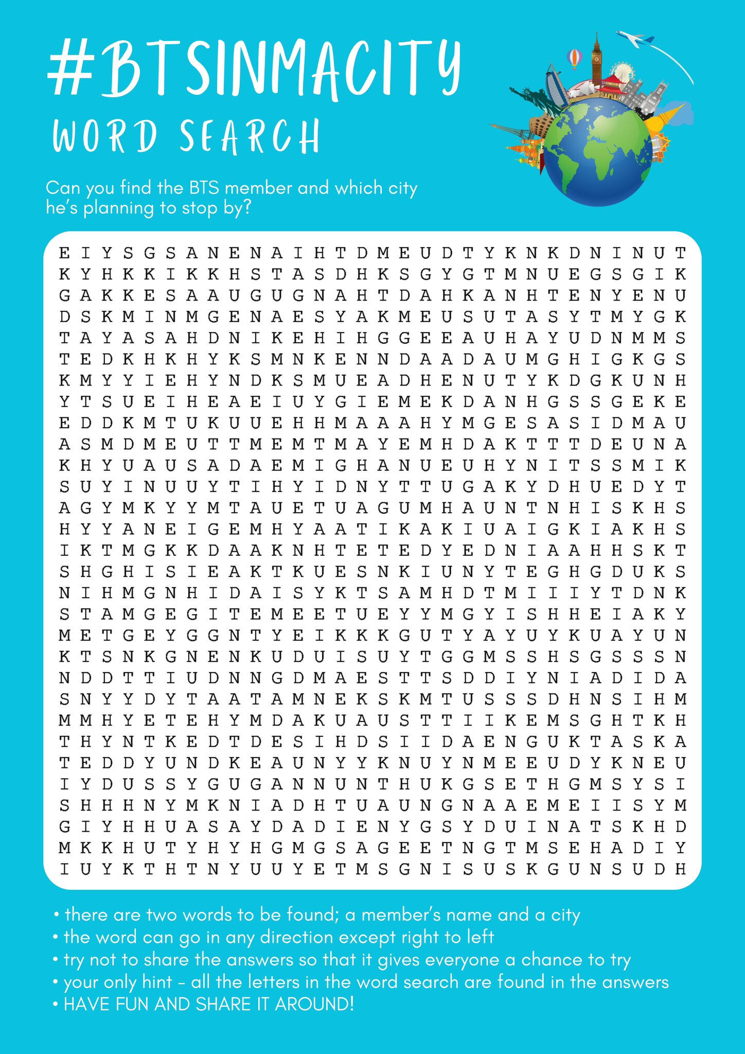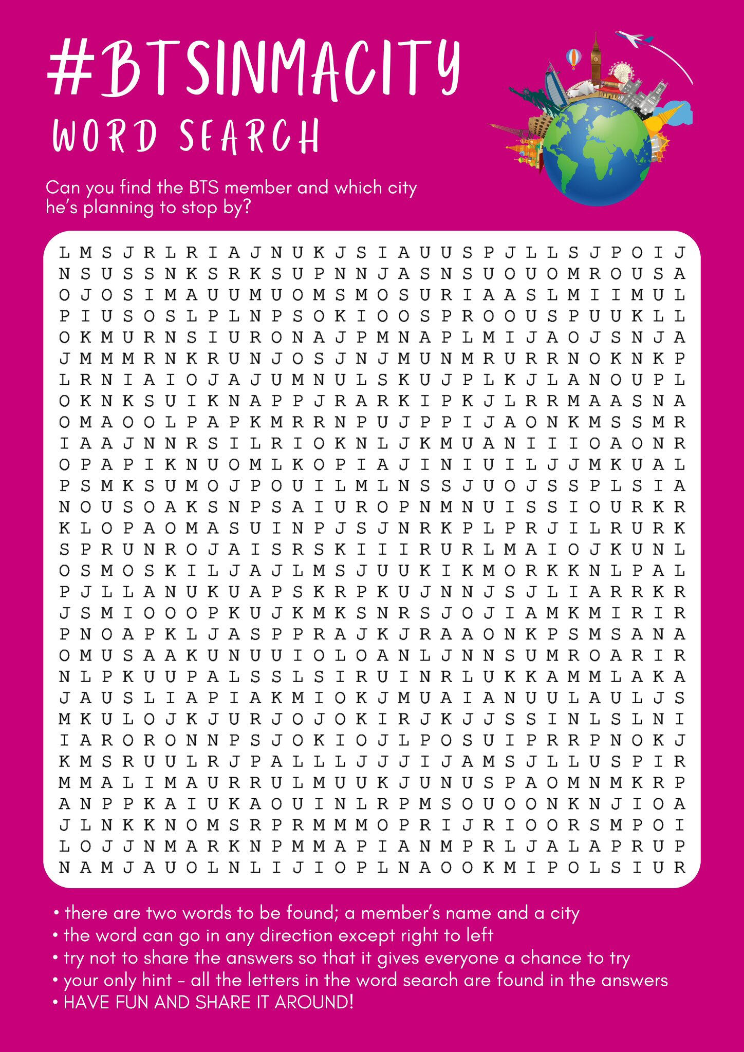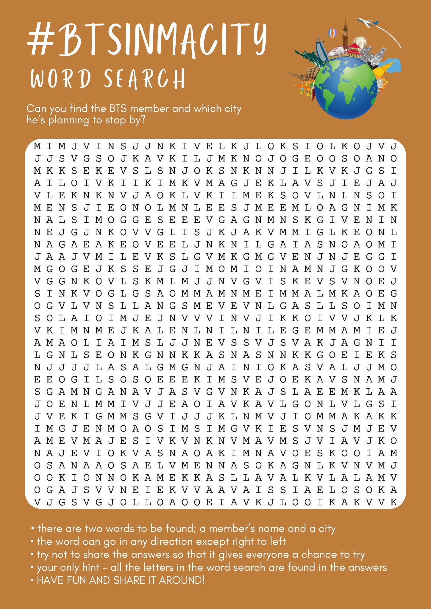 Can you find the missing BTS member and which city he’s planning to stop by?Rules: